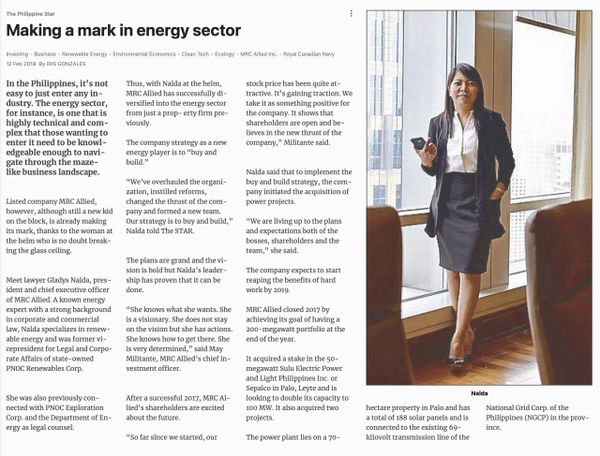 She is the former Vice President for Legal & Corporate Affairs of PNOC Renewables Corporation, the renewable energy subsidiary of the state-owned Philippine National Oil Company Group of Companies. Concurrent with this role, she worked with affiliates and partners of the DOE in developing policy regulations to improve the renewable energy sector of the country.